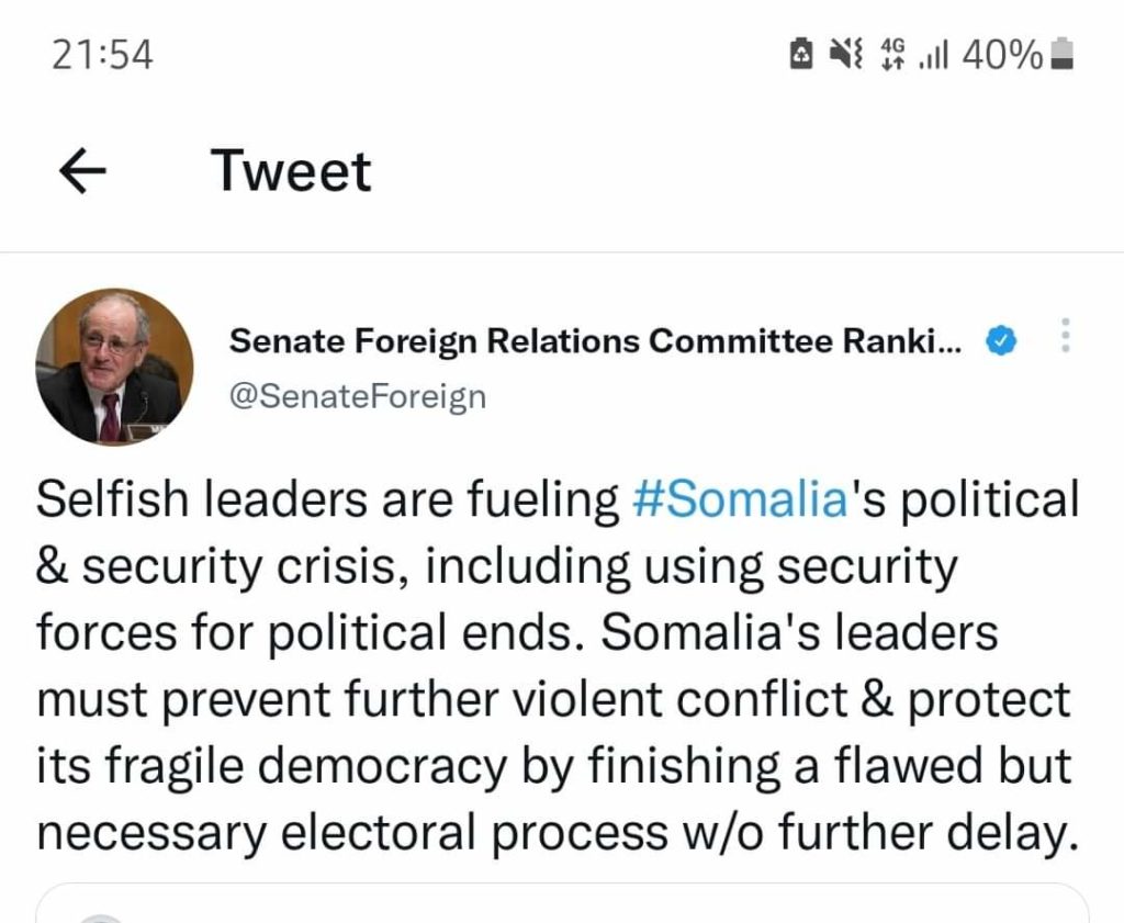 Sidoo kale Seneter ka mid ah Guddiga Xiriirka Dibadda ee Senate-ka Mareykanka,ayaa isna yiri…