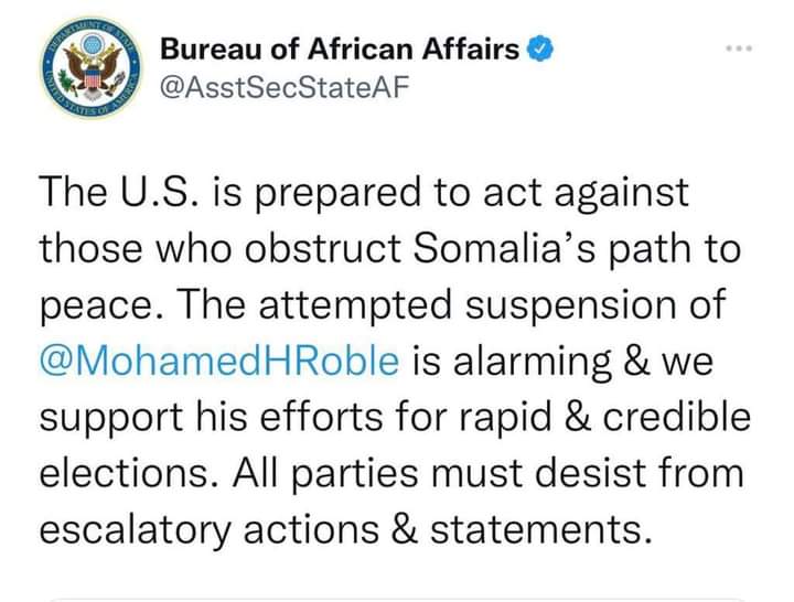 “Maraykanku wuxuu diyaar u yahay in uu tallaabo ka qaado kuwa carqaladda ku ah waddada nabadda ee Soomaaliya. Isku dayga lagu joojinayo MohamedHRoble waa wax laga naxo waxaana taageeraynaa dadaalkiisa doorasho degdeg ah oo lagu kalsoonaan karo. Dhammaan dhinacyadu waa in ay ka waantoobaan ficillada iyo oraahyada kicinta ah.”