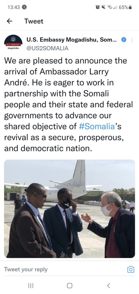 Qoraalka safaaradda oo lasoo dhigay Twitter ayaa lagu yiri “waxaan ku faraxsannahay inaan ku dhowaaqno imaatinta Danjire Larry Andre.”