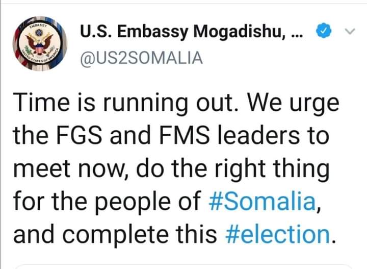 “Waqti ayaa socda waxaan ku boorinaynaa Dowladda Federaalka iyo Dowladaha xubnaha ka ahba inay hada u kulmaan” ayaa lagu yiri qoraalka Safaaradda Mareykanka.