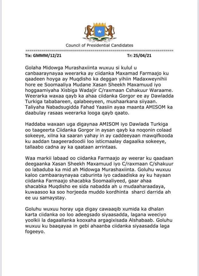 Midowga Musharixiinta ayaa uga digay Ciidanka AMISOM iyo Turkiga in aysan qeyb ka noqon colaada sokeeye, ee uu hurinayo Farmaajo.