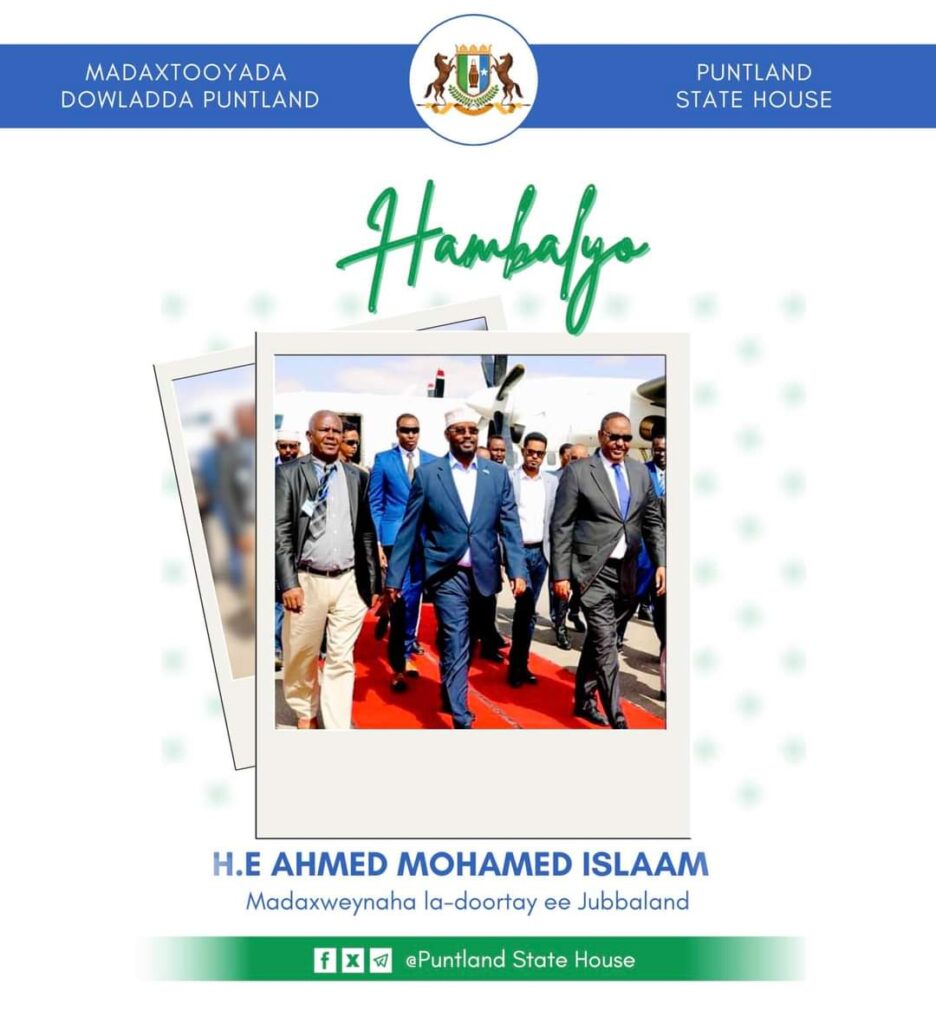 Jubaland waxaan u rajeynaynaa nabad iyo horumar, waxaana ugu baaqaynaa Dowladda Jubaland iyo Shacabkaba in la illaaliyo oo laga wada shaqeeyo amniga iyo xasilloonida Jubaland, wixii kala aragti duwanaansho ahna in lagu xaliyo wadahadal.” Madaxweynaha Dowladda Puntland Mudane Siciid Cabdullaahi Deni.