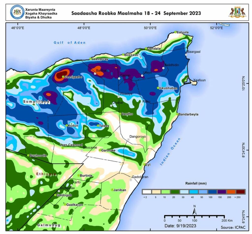 Sida kamuuqata khariidadda saadasha roobka meela kamid ah degmooyinka Ceerigaabo, Badhan, iyo Balidhidin ayaa laga yaabaa inuu gaaro 200mm.