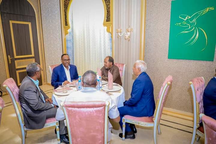 Madaxweynaha Dowladda Puntland Mudane Siciid Cabdullaahi Deni, ayaa caawa kulan Casho Sharaf ah ugu sameeyay xarunta Madaxtooyada, Madaxweynaha JFS Mudane Xasan Shiikh Maxamuud iyo wafdiga la socda.