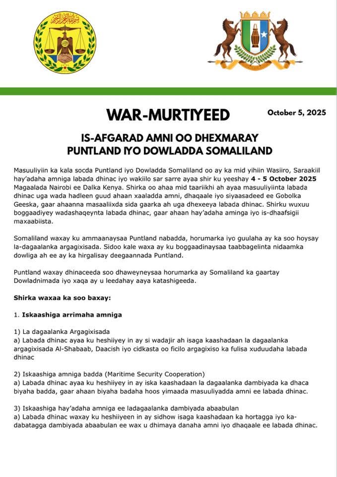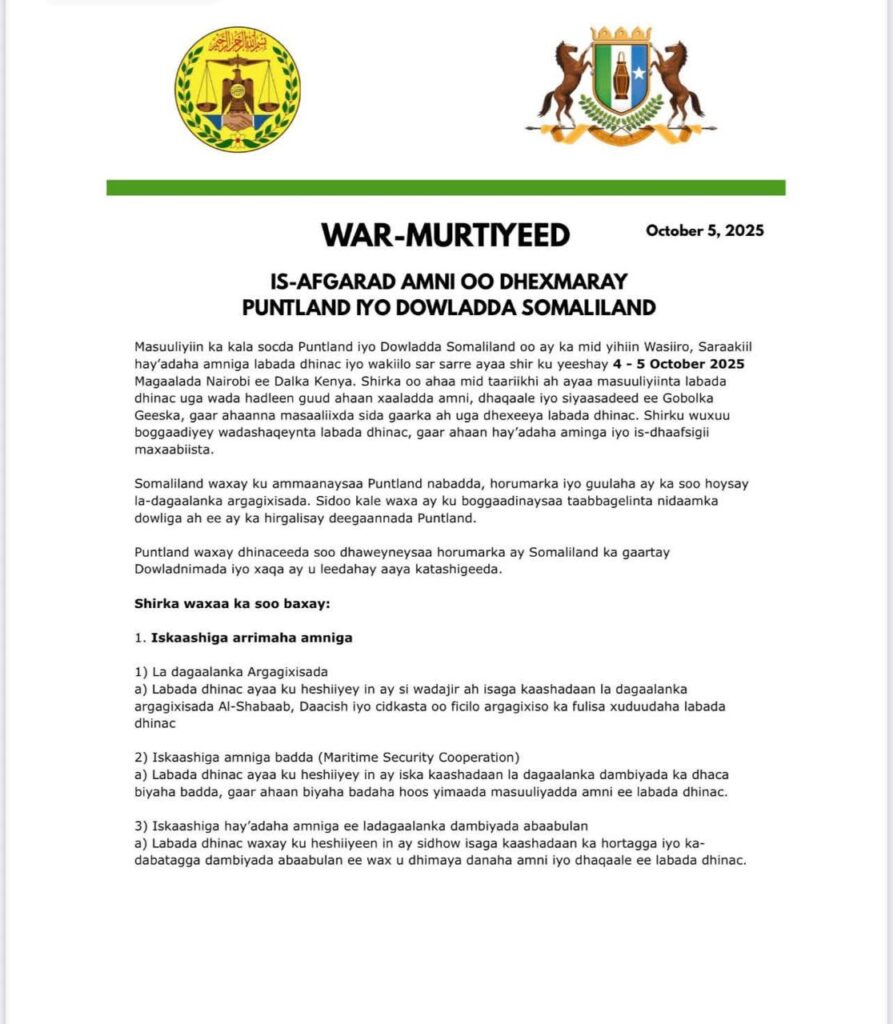 Share Facebook Twitter LinkedIn Pinterest Email Copy Link Kulamo wax ku ool ah,ayaa uga soo dhamaaday Nayrobi PL & SL. Qodobada kulamada looga xaajooday,waxaa ugu waa weynaa Laba arimood oo kala ah….. 1.Amniga.2.Duulimaadyada. PL& SL,waxay wadajir uqaateen go’aan mid ah oo ay la wadaagayaan QM.