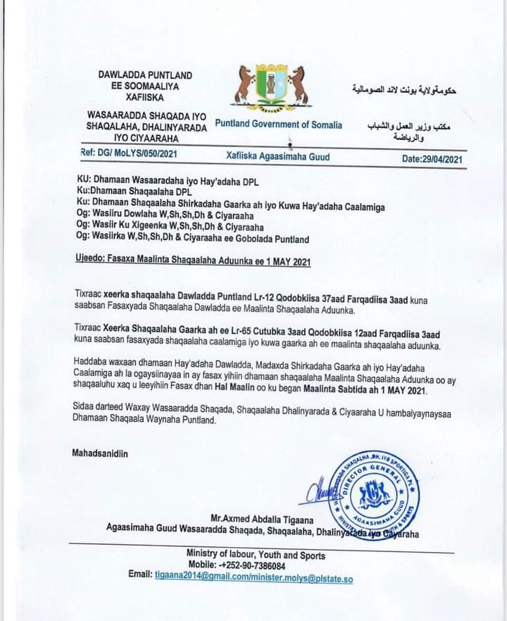 Wasaaradda Shaqada, Shaqaalaha, Dhalinyarada iyo Ciyaaraha Dowladda Puntland oo Waraaq soo saartay ayaa fasaxday maalinta sabtida ah dhamaan Shaqaalaha Puntland, maadama ay ku beegan tahay 1 bisha May, oo ah maalinta Shaqaalaha Adduunka.