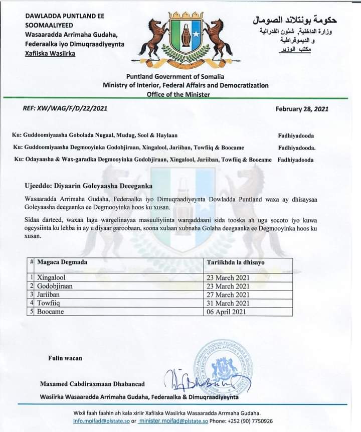 Wasiirka Wasaaradda Arrimaha Gudaha, Federaalka iyo Dilmuquraadiyeynta Dowladda Puntland Maxamed Cabdiraxmaan Dhabancad, ayaa qoraal uu soo saaray ku sheegay in Wasaaraddu ay bilaabayso bisha soo socota ee Maarso dhismaha Golayaasha Deegaanka ee Degmooyinka Godobjiraan, Xingalool, Jariiban, Towfiiq iyo Boocame, oo ka kala tirsan Gobalada Mudug, Nugaal, Sool iyo Haylaan.