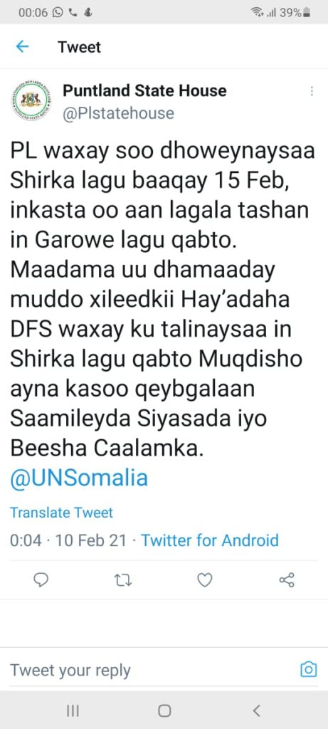 Puntland oo ka hor timid Shirkii Farmaajo ku baaqay