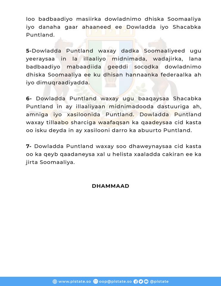 Sidoo kale, Dowladda Puntland ayaa ku goodisay in ay tallaabo kale qaadi doonto, iyadoo ka duuleysa go’aanadii shirweynihii Puntland, haddii lagu soo laaban waayo wada-hadalka.