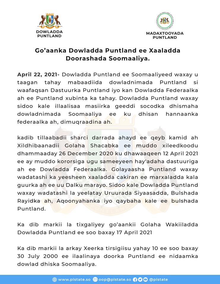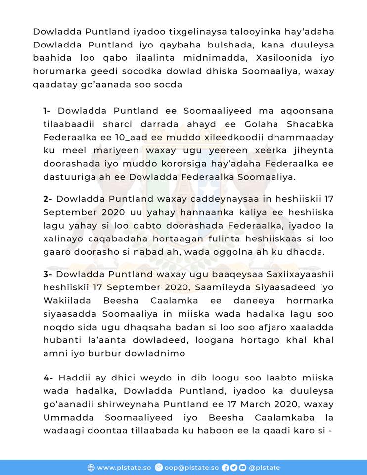 War Saxaafadeed ka kooban 7 qodob ayay Puntland ku baaqday in miiska wadahadalka doorashada ee heshiiskii 17-kii September 2020 dib loogu soo laabto.