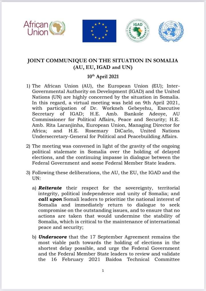 Qoraal wadajir ah oo ay soo saareen Qaramada Midoobey, IGAD, Midowga Yurub iyo Midowga Afrika ayaa waxay walaac kaga muujiyeen is mari waaga ka tagaan doorashada, iyagoona ugu baaqay Madaxda DFS ee muddo-xileedkoodu dhamaaday iyo Dowlad Gobaleedyada inay ku laabtaan miiska Wada-hadalka.
