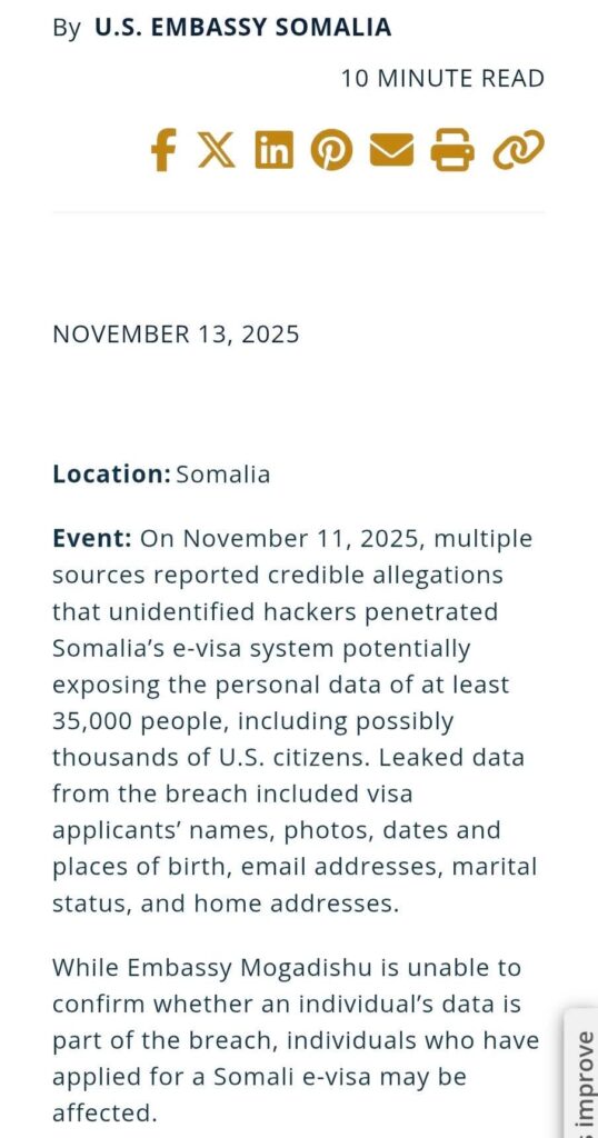 Safaarada Maraykanka oo sheegtay in la jabsaday xogta E-visa Somaliya