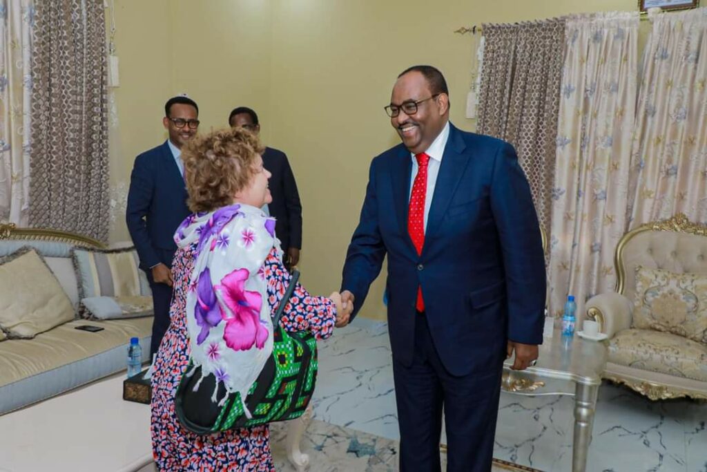 Garoowe, 25 January 2024, Madaxwaynaha Dowladda Puntland Mudane Siciid Cabdullaahi Deni, ayaa Garoonka Diyaaradaha ee Garoowe kusoo dhoweeyay wakiilka Ergayga ah ee Qaramada mdoobay ee Soomaaliya Marwo Catriona Laing iyo Wafti ay hoggaaminayso oo ka qeybgalaaya xaflada Caleemasaarka Madaxweynaha iyo Madaxweyne Ku-xigeenka dowladda Puntland.