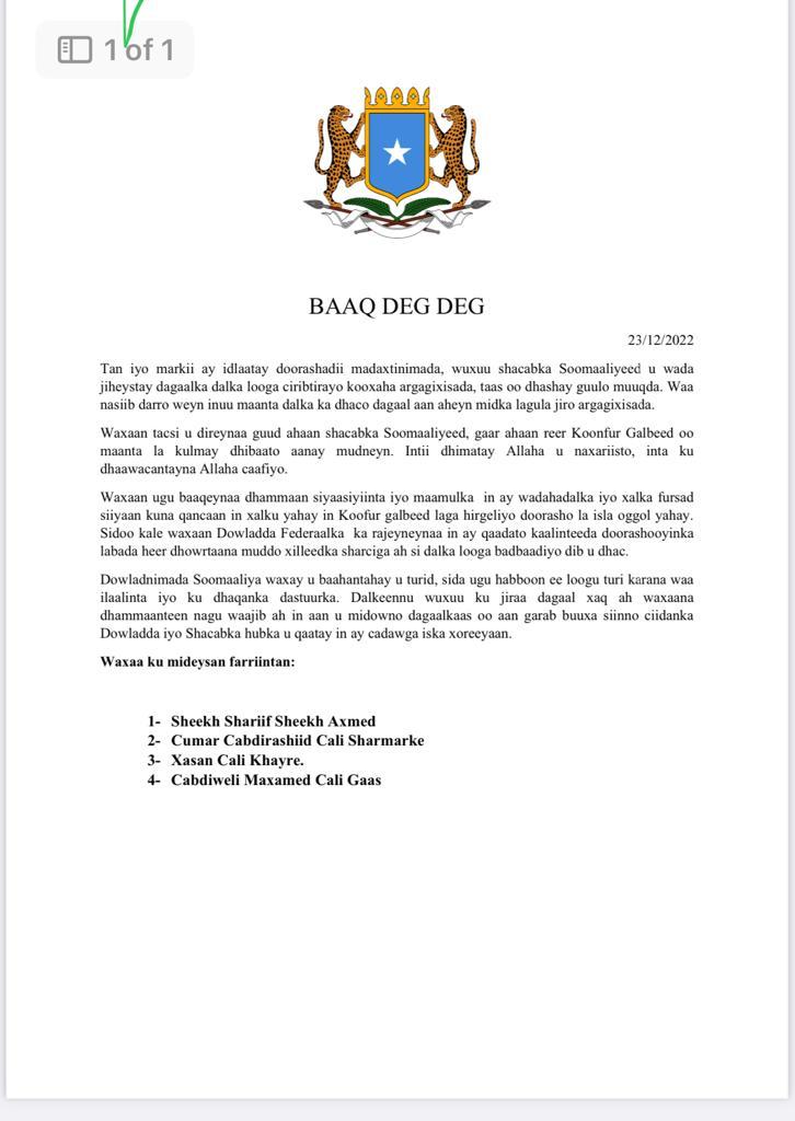 Madaxweynihii hore Sh.Shariif,Ra’isalwasaarihii hore Cumar Cabdirashiid,Madaxweynihii hore ee PL Cabdiweli Gaas iyo Ra’isalwasaarihii hore Xasan Xali Khayre,ayaa baaqan si wadajir ah usoo saaray.