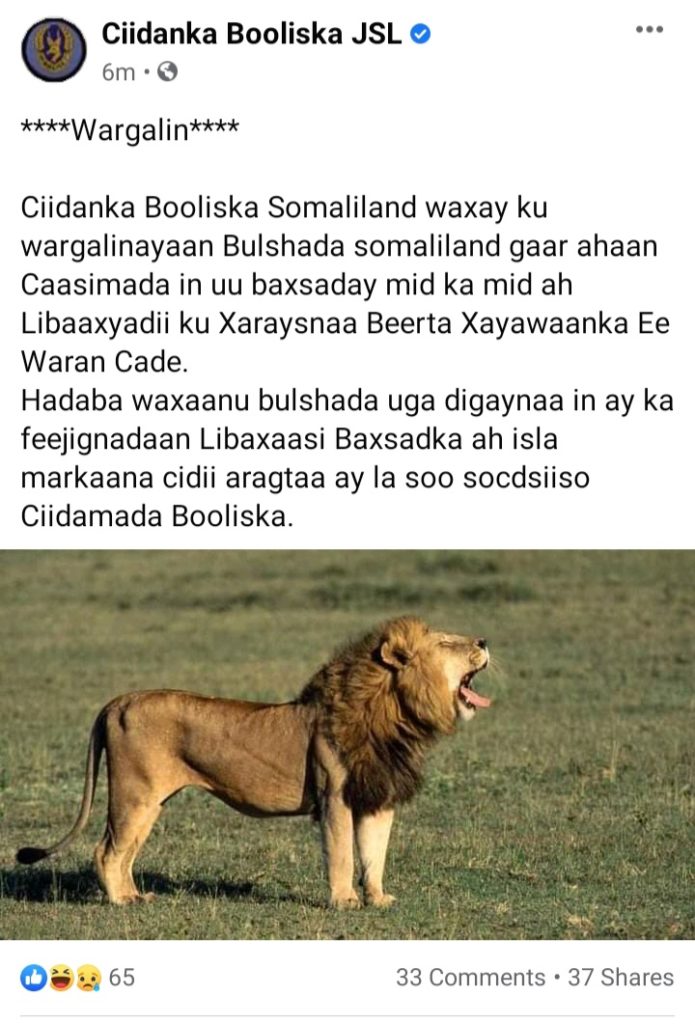 Booliska ayaa ugu baaqay Shacabka inay ka feejignaadaan Libaaxan baxsadka ah, hadii ay arkaana ay kusoo wargaliyaan Ciidanka.