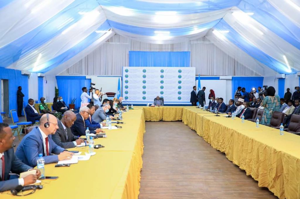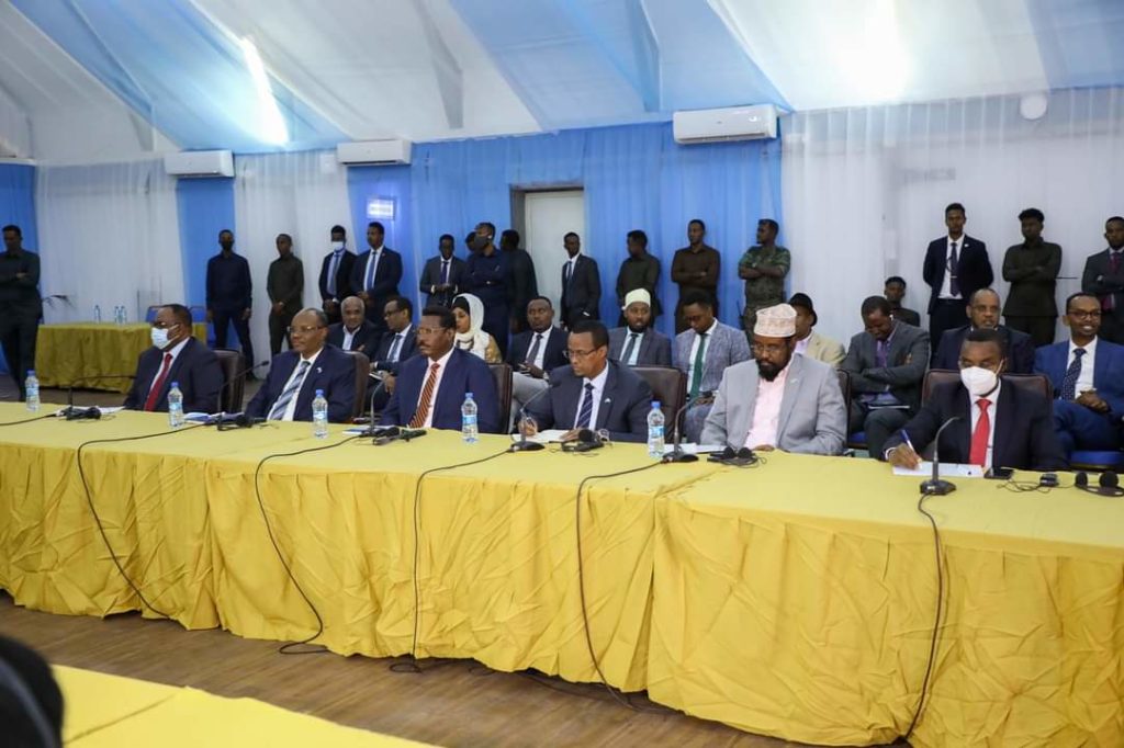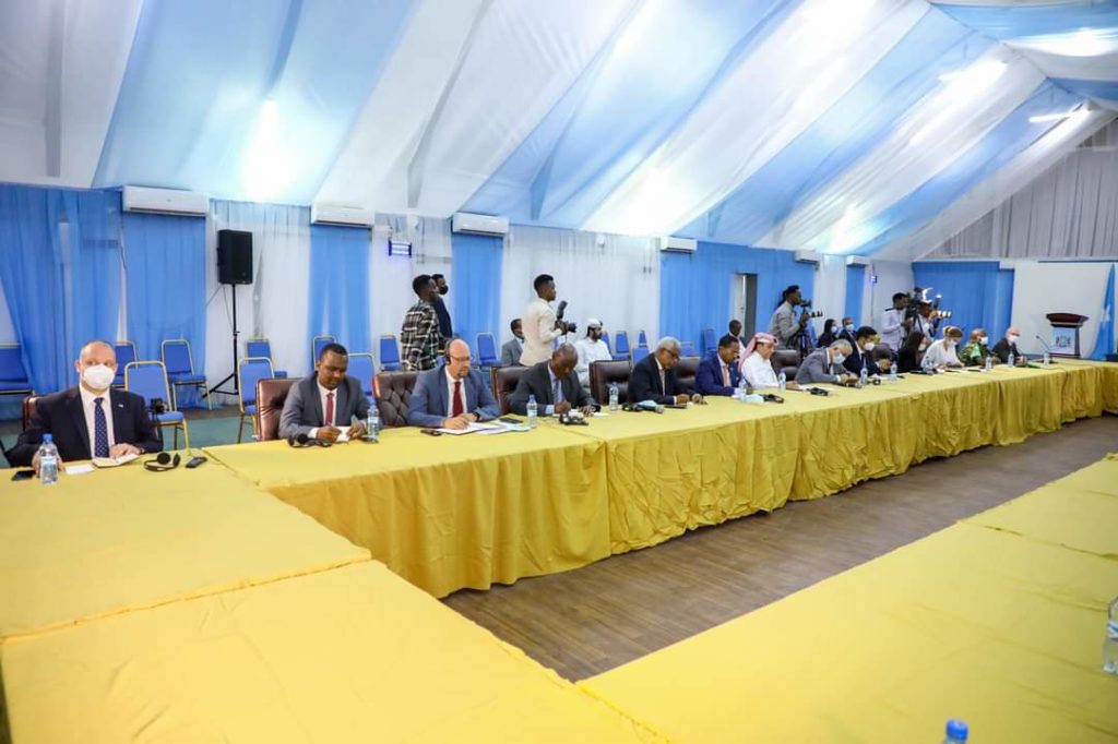 Raβiisul Wasaaraha XFS Maxamed Xuseyn Rooble oo ay wehliyaan Madaxweynayaasha kale ee Golaha Wadatashiga Qaranka,ayaa kulan la yeeshay wakiillada Beesha Caalamka oo ay ka wada hadleen dardargalinta doorashooyinka dalka.