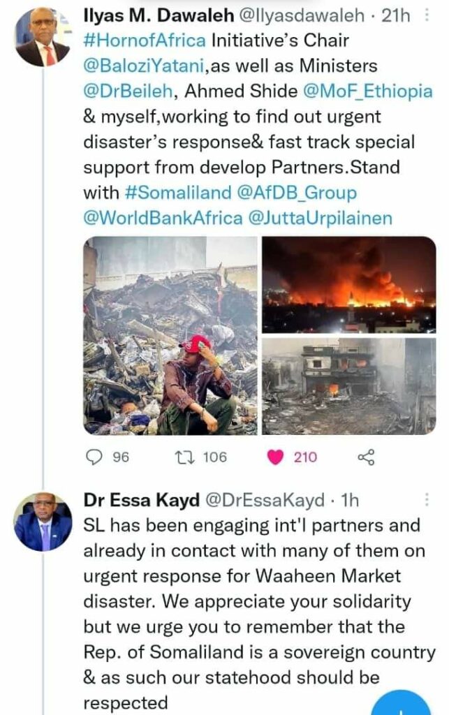 “Somaliland mar horeba waa la xiriirtay cid kasta oo gacan ka geysan karta Aafada suuqa Waaheen”