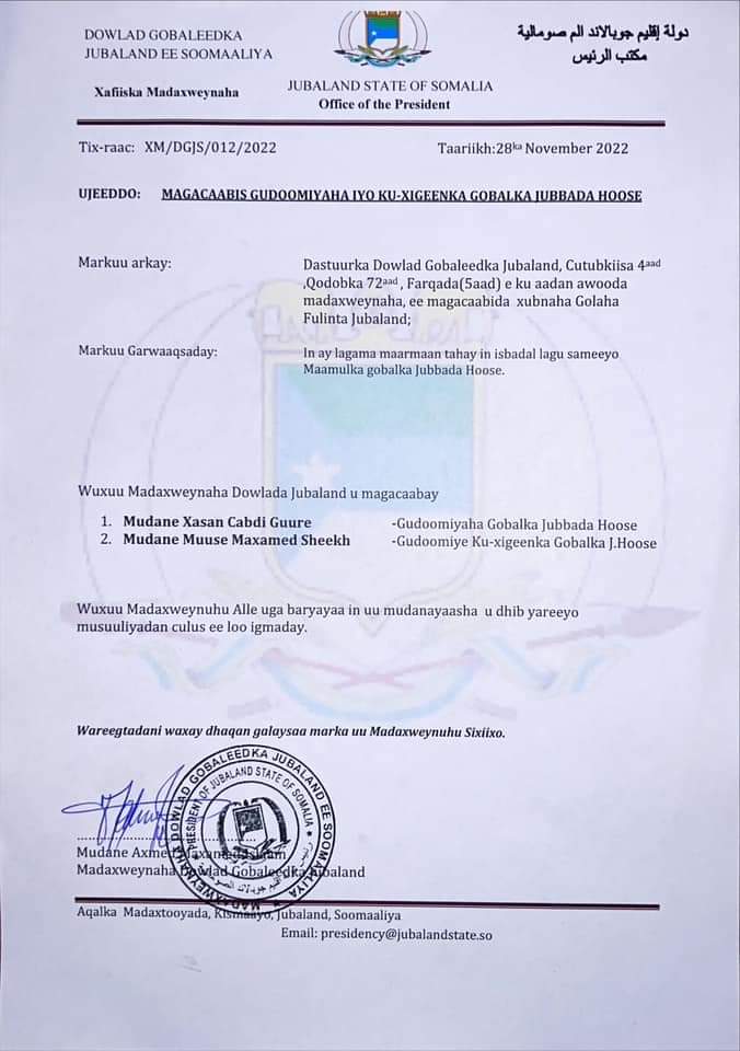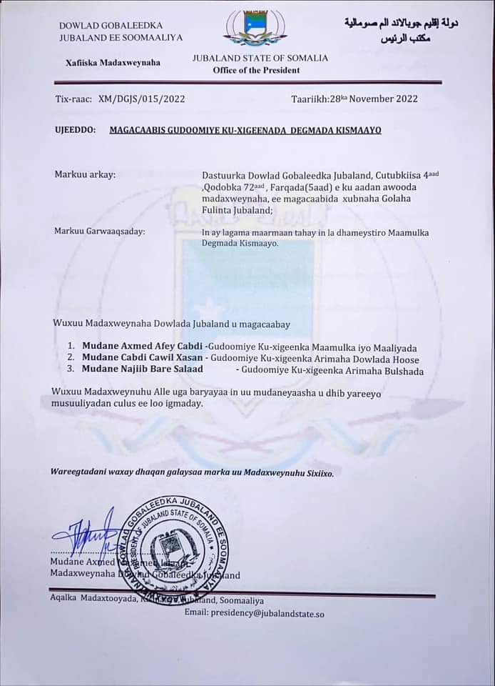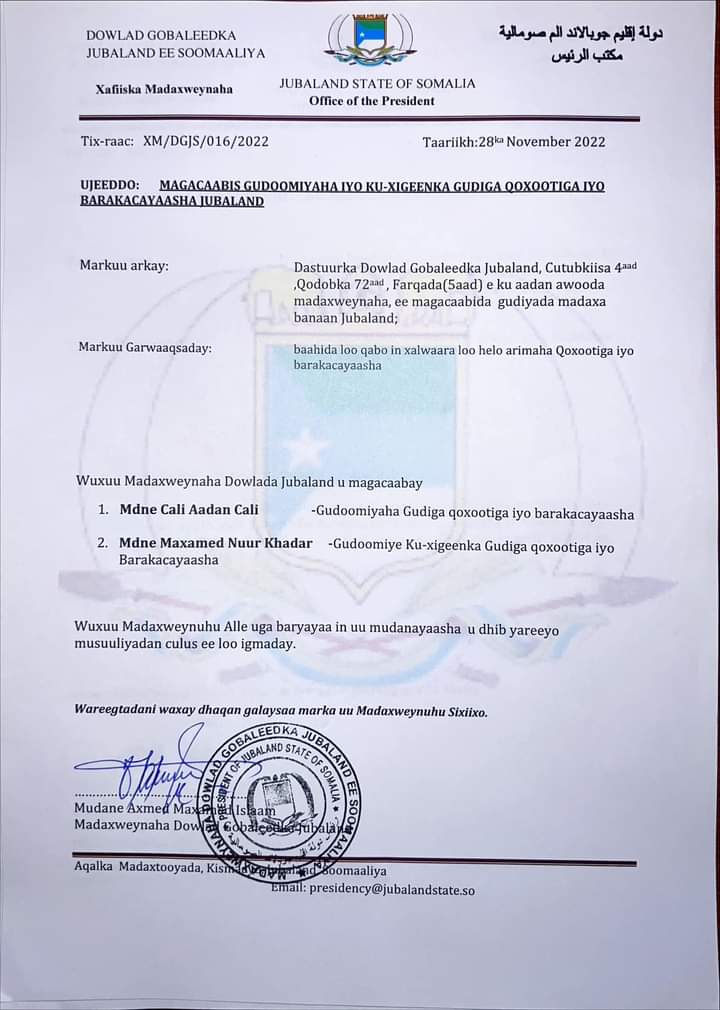 Sidoo kale Madaxweynaha Dowlada Jubaland Axmed Maxamed Islaam,ayaa Magacaabay Gudoomiyaha iyo ku xigeenka Guddiga Qoxootiga iyo Barakacayaasha Jubaland.