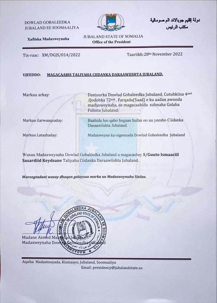 Waxuu kaloo Madaxweyne Axmed Maxmed Islaam, umagacaabay S/Guuto Ismaaciil Saxardiid Keydsane Taliyaha guud ee Ciidamada Darawiishta Jubaland.