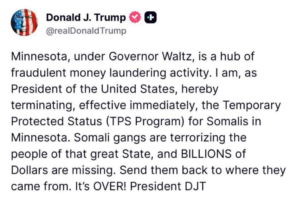“President Trump revoked deportation protections for Somali immigrants in Minnesota, saying in a post, “Somali gangs are terrorizing the people of that great State, and BILLIONS of Dollars are missing. Send them back to where they came from. It’s OVER!”