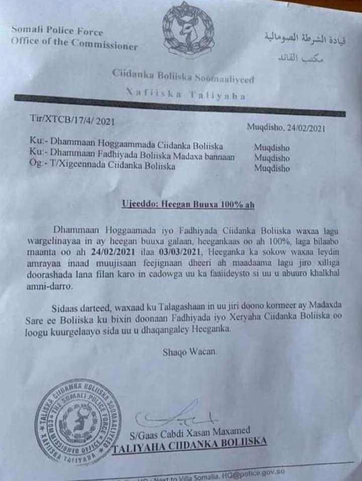 Taliyaha Ciidanka Booliska Dowladda Federaalka Soomaaliya ee waqtigeedu dhamaaday ayaa heegan 100% galiyay Ciidanka Booliska Muqdisho, kaddib cabsi soo wajahday Villa Somalia.
