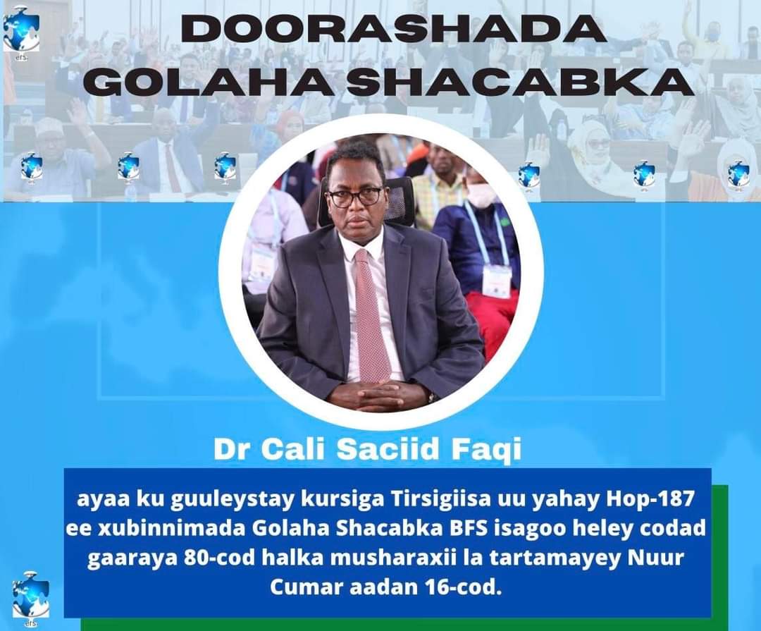 Dr Cali Saciid Faqi ayaa ku guuleystay kursiga Tirsigiisu uu yahay Hop-187 ee xubinnimada Golaha Shacabka BFS isagoo heley codad gaaraya 80-cod halka musharaxii la tartamayey Nuur Cumar aadan uu helay 16-cod.