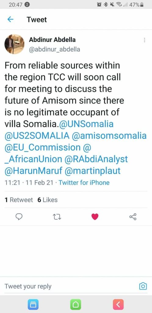 Share Facebook Twitter LinkedIn Pinterest Email Copy Link Wadamada Ciidamadu Ka joogaan Smaliya,ayaa Ka shiri doona Mustaqbalka Amisom maadaama aysan Somalita Dowlad Ka jirin xiligan. Ilo Diblomaasi oo lagu kalsoonaan karo,ayaa xaqiijiyay xogtan.