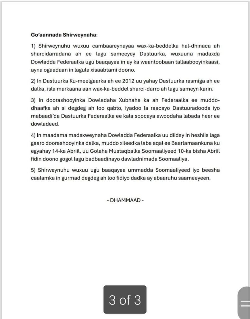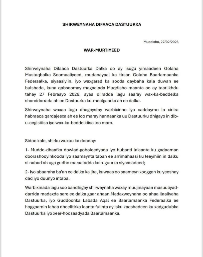 Golaha Mustaqbalka Soomaaliyeed,ayaa ku dhawaaqay gogol wadatashi Qaran ah si dalka looga badbaadiyo firaaq dastuuriga ah marka la gaaro 14-ka Apriil 2026, iyagoo ugu baaqay dhinacyada siyaasadda in ay heshiis midaysan gaaraan.