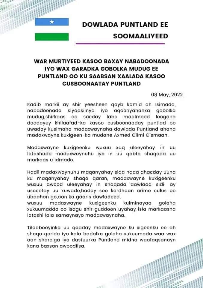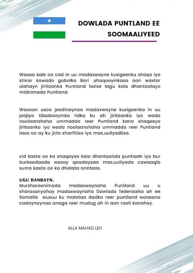 Share Facebook Twitter LinkedIn Pinterest Email Copy Link Waxgaradka Gobolka Mudug oo baaq udiray Madaxweyne xigeenka Puntland ay ugu sheegayaan in uu joojiyo kala qaybinta Bulshada,taaa badalkeedana uu ka shaqeeyo midnimadooda iyo wada noolaanshahooda.
