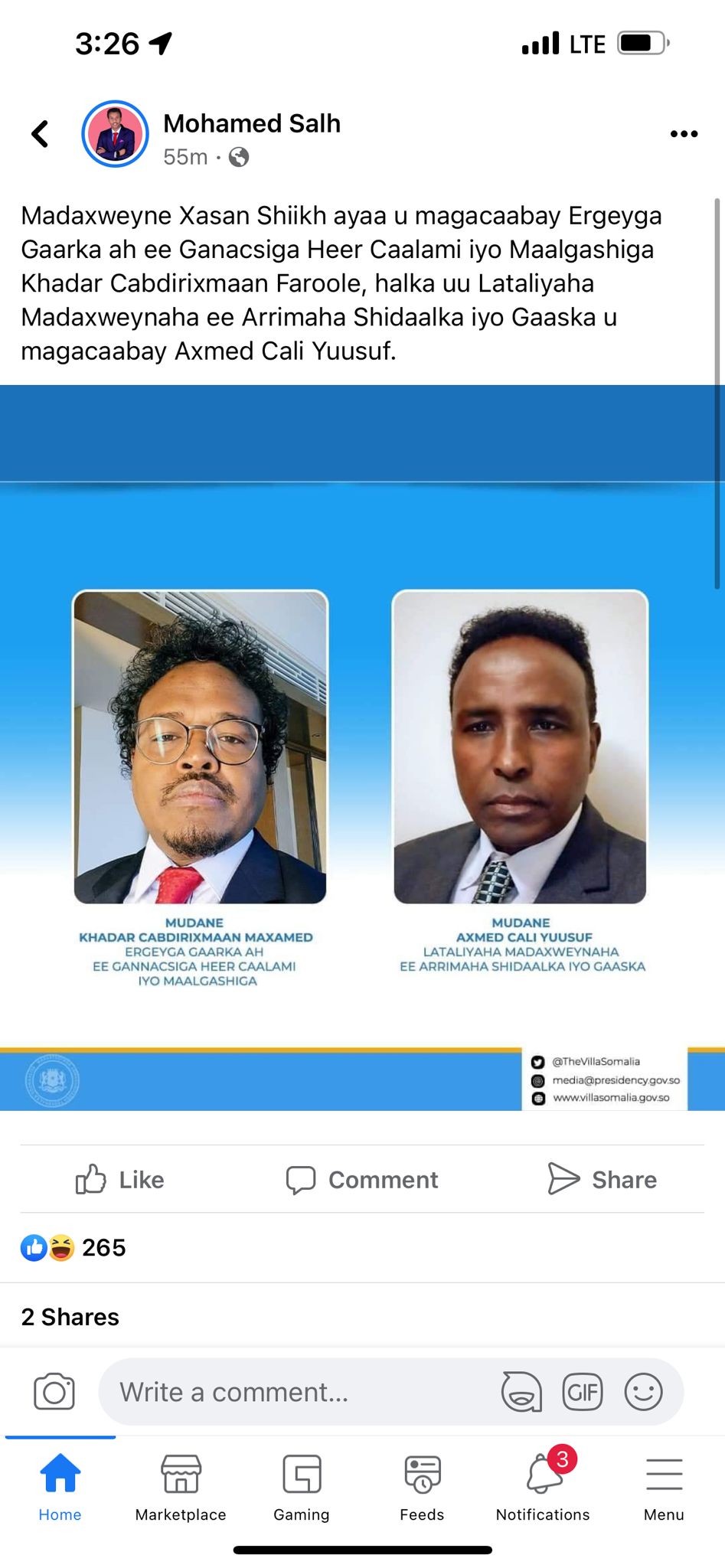 “Madaxweynaha oo ka duulaya muhiimadda ay leedahay horumarinta nolasha shacabka Soomaaliyeed, kobcinta dhaqaalaha iyo ka faa’iideysiga Khayraadka dalka ayaa magacaabay Ergeyga Gaarka ah ee Ganacsiga Heer Caalami iyo Maalgashiga Mudane Khadar Cabdirixmaan Maxamed iyo Lataliyaha Madaxweynaha ee Arrimaha Shidaalka iyo Gaaska Mudane Axmed Cali Yuusuf,” ayaa lagu yiri qoraalka ka soo baxay xafiiska madaxweynaha.