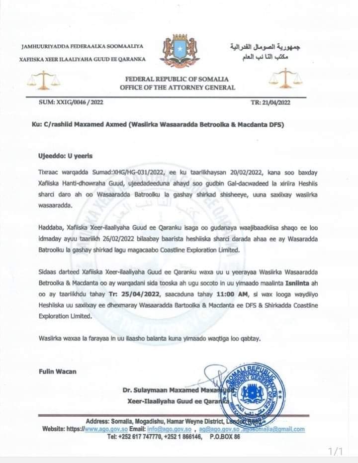 Xafiiska Xeer Ilaaliyaha Qaranka ayaa uyeeray Wasiirka wasaarada Betroolka XFS Cabdirashiid Maxamed Axmed Si wax looga Weydiiyo Heshiis Wasiirku La galay Shirkad Shidaal oo Shisheeye ayaa lagu Yiri qoraalka kasoo baxay Xeer Ilaaliyaha Qaranka.