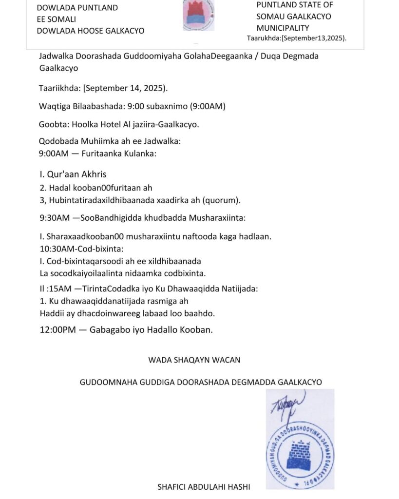 Share Facebook Twitter LinkedIn Pinterest Email Copy Link Guddiga doorashada Duqa Magaalada Galkacyo,ayaa si rasmi ah u shaaciyey wakhtiga ay qabsoomayso doorashada Duqa. Halkan ka akhriso:-