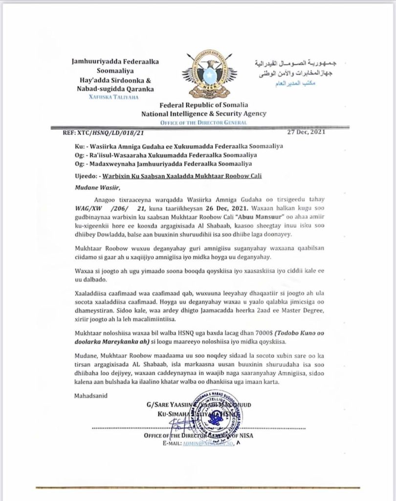 β€œMukhtaar Roobow noloshiisa waxaa bil walba NISA uga baxda 7,000 oo dollar si loo maareeyo noloshiisa iyo midka qoyskiisa, maadaama uu xubin ka noqday Al-Shabaab, isla markaana uusan buuxin shuruudaha soo dhiibaha loo dejiyay inuu waajib ka saaran yahay amnigiisa” ayaa lagu yiri Warka qoraalka.